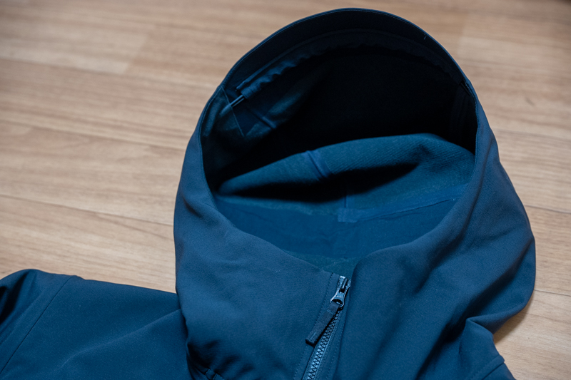 フードはいつものアークテリクス仕様でヘルメット対応なので大きいが,チンガードがかなりしっかりしていて首元の風はかなり防げる.