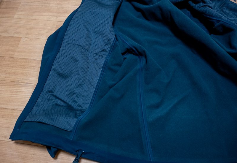 Gamma MXの特徴でもある裏側のフリース素材.思っていたより薄めだが,これがあるだけでも大きく違う.背中の部分は起毛したような素材になっていて,お腹側の部分はメッシュ的な素材が入っている.どちらも非常に滑らかで着心地が良い.このおかげでシェルらしからぬ着心地の良さを実現していると思う.