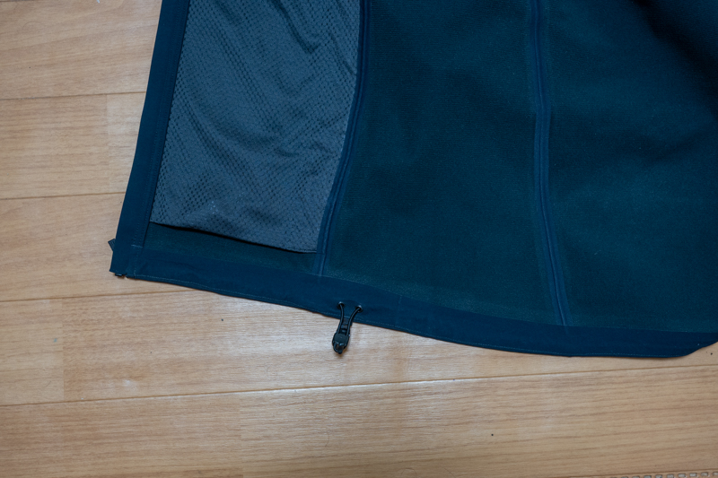 内側にはドローコードがついていてチンガードを調整できる.ただし,内側に配置してしまったために非常に操作しにくくなっており,一回ジップを下ろさないと調整できない.別途紹介するベータSLのように外側に配置してくれていれば...と思ってしまう.